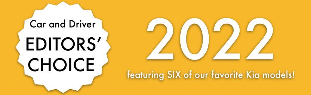 We are thrilled to announce that SIX Kia models were named Car and Driver 2022 Editors’ Choice award winners! More than 400 models were tested, rated and ranked across all segments. All vehicle types, including crossovers, SUVs, electric vehicles, sedans, trucks, and family sized vans were taken into account. The Car and Driver team of automotive experts explored the data, drove hundreds of thousands of miles, and applied rigorous testing to determine the best vehicles available today!