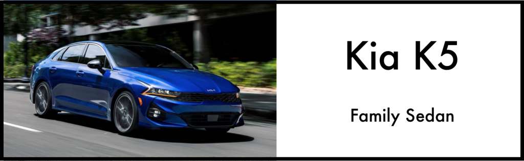 “The K5 is a stylish and nicely appointed family sedan, and also a great value.” Both the interior and exterior of the K5 are beautifully designed. The price point is accessible, offering tons of the most popular features available on the market today. You can access your vehicle from your smartphone, with remote start, climate settings, security, and maintenance updates. If you want more pep, the 290-hp GT model is a thrill to drive.