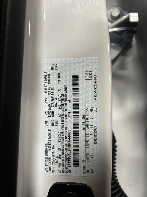 This 2025 Ford F-150 come equipped with, 4WD, 4 Pickup Box Tie-Down Plates, 4-Wheel Disc Brakes, 8 Speakers, ABS brakes, Adjustable pedals, Air Conditioning, Alloy wheels, AM/FM radio: SiriusXM with 360L, Auto High-beam Headlights, Auto-dimming door mirrors, Auto-dimming Rear-View mirror, Automatic temperature control, Bed Utility Package, Brake assist, Bumpers: body-color, Compass, Delay-off headlights, Driver door bin, Driver vanity mirror, Dual front impact airbags, Dual front side impact airbags, Electronic Locking w/3.73 Axle Ratio, Electronic Stability Control, Emergency communication system: SYNC 4 911 Assist, Equipment Group 401A Standard, Front anti-roll bar, Front Bucket Seats, Front Center Armrest, Front dual zone A/C, Front fog lights, Front License Plate Bracket, Front reading lights, Front wheel independent suspension, Fully automatic headlights, GVWR: 7,100 lbs Payload Package, Heated door mirrors, Heated front seats, Illuminated entry, Integrated Trailer Brake Controller, Internet access capable: FordPass Connect 5G, LED Box Lighting, Low tire pressure warning, Navigation system: Connected Navigation, Occupant sensing airbag, Outside temperature display, Overhead airbag, Overhead console, Panic alarm, Passenger door bin, Passenger vanity mirror, Power door mirrors, Power driver seat, Power passenger seat, Power steering, Power Tailgate, Power windows, Radio data system, Radio: B&O Sound System by Bang & Olufsen, Rear reading lights, Rear step bumper, Rear window defroster, Remote keyless entry, Security system, Speed control, Split folding rear seat, Steering wheel mounted audio controls, SYNC 4 w/Enhanced Voice Recognition, Tachometer, Tailgate Step w/Tailgate Work Surface, Telescoping steering wheel, Tilt steering wheel, Tough Bed Spray-In Bedliner, Tow/Haul Package, Traction control, Trip computer, Turn signal indicator mirrors, Unique Sport Cloth 40/Console/40 Power Front Seat, Variably intermittent wipers, Voltmeter, Wheels: 18 Alloy w/Dark Matte Finish, 4WD.